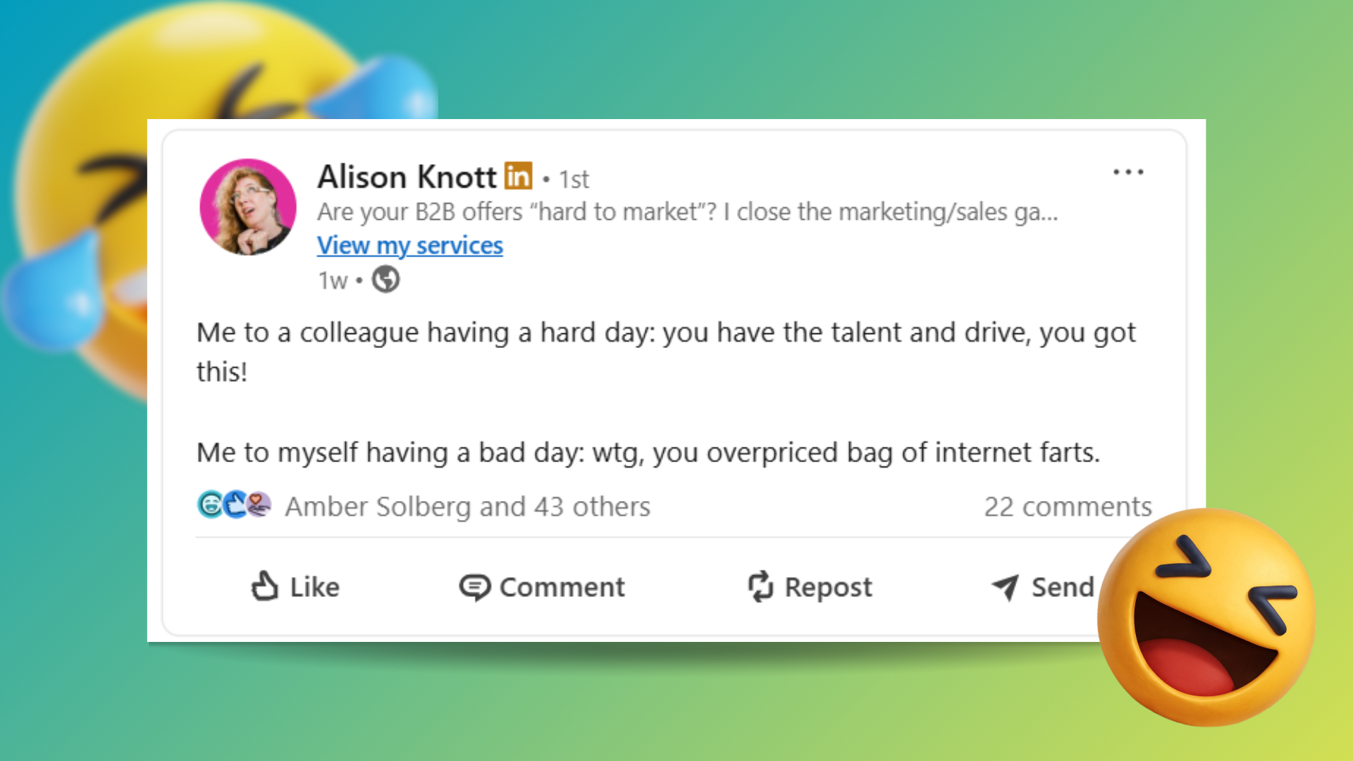 Alison Knott, who mentored me for the first several years of my marketing career, offered camaraderie and humour in a way that made me stop scrolling immediately.